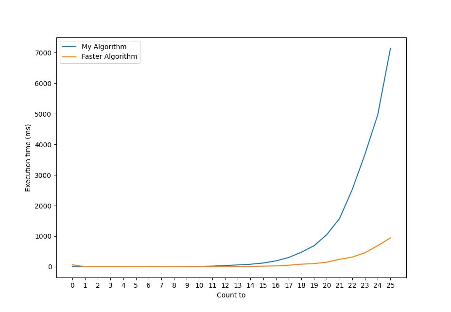 The time complexity of this solution scales so quickly that finding the answer for 10 takes a few milliseconds, whereas finding 25 takes over 7 seconds!