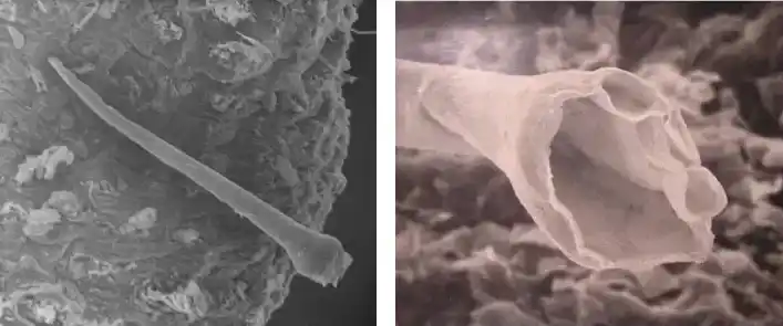 These are some images of the trichomes, taken with an electron microscope2. The first image shows the spicule penetrating the skin and the second shows its hollow structure. The hairs are so tiny, around 1mm in length, that they can easily penetrate the skin when lightly brushed and subsequently break off from the leaf.