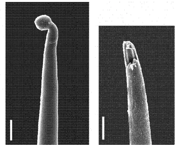 At the tip is a bulb shape which breaks off to expel the stinging fluid from the hair, only 4 nL. This image shows the tips of the trichomes before and after the tip is broken1.